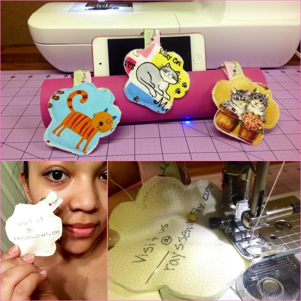 I got straight to it, pulled out kitty themed fabric and scraps, batting pieces, found some ribbon on clearance at Joann’s, bought some keychain rings and VIOLA!!