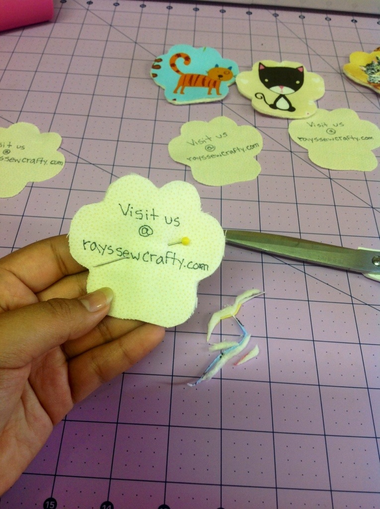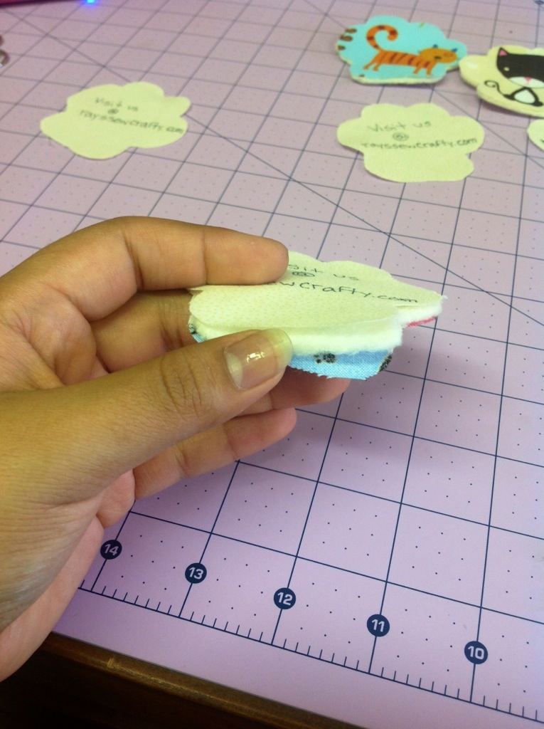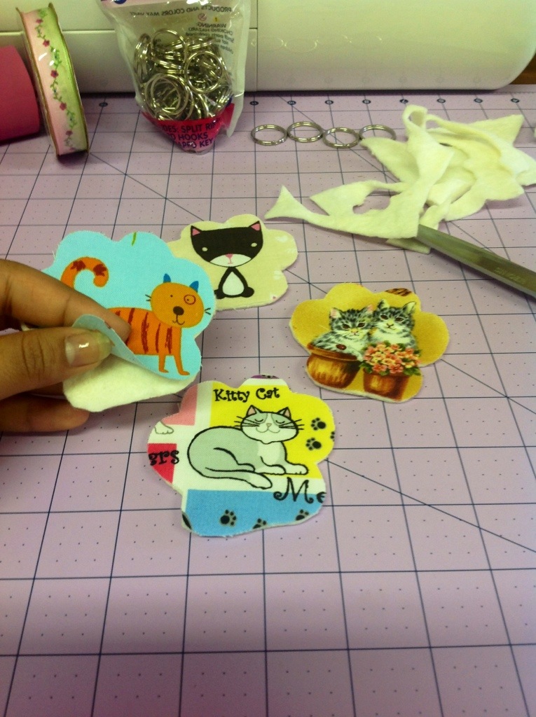 5. After getting my paw prints crispy straight, I lay them on my scraps of batting to prepare to cut. You will only need one piece of batting per keychain. I simply placed the paw prints on top of the batting and cut around the paw print. Giving me a perfect sized batting for my keychains. šŸ™‚