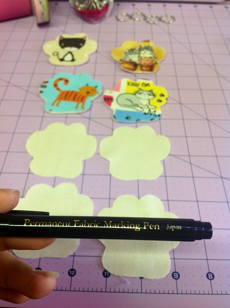 2. Trace your design onto your fabric with your removable fabric marker. I like to use this friction pen, the markings come off by simply ironing your fabric when your done utilizing the pen markings. You are going to have to cut two pieces of fabric for one keychain. I used kitty themed fabric for the front and a solid cream for the back. You can have fun and mix and match your front and back to your liking.