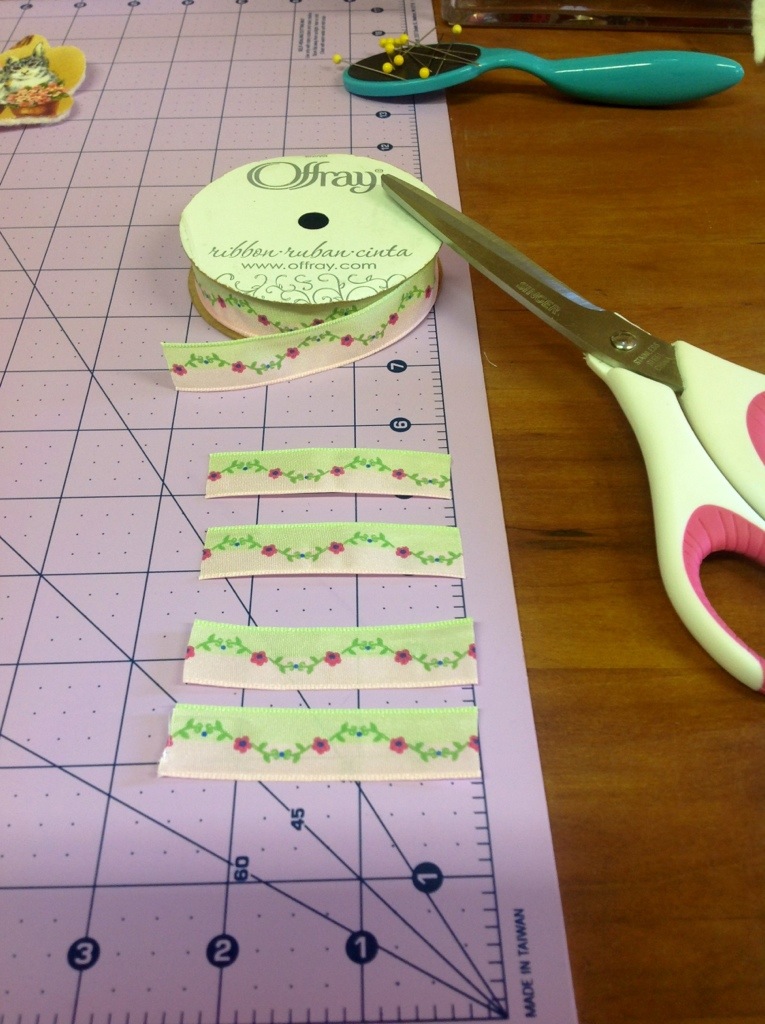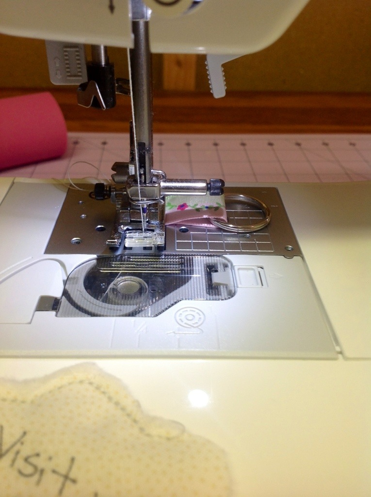 9. Grab your ribbon, doesn’t matter how wide it is, I chose to use this thin ribbon. I cut pieces 2-1/2″ long and slip a keyring in each ribbon, fold in half and prepare to sew.