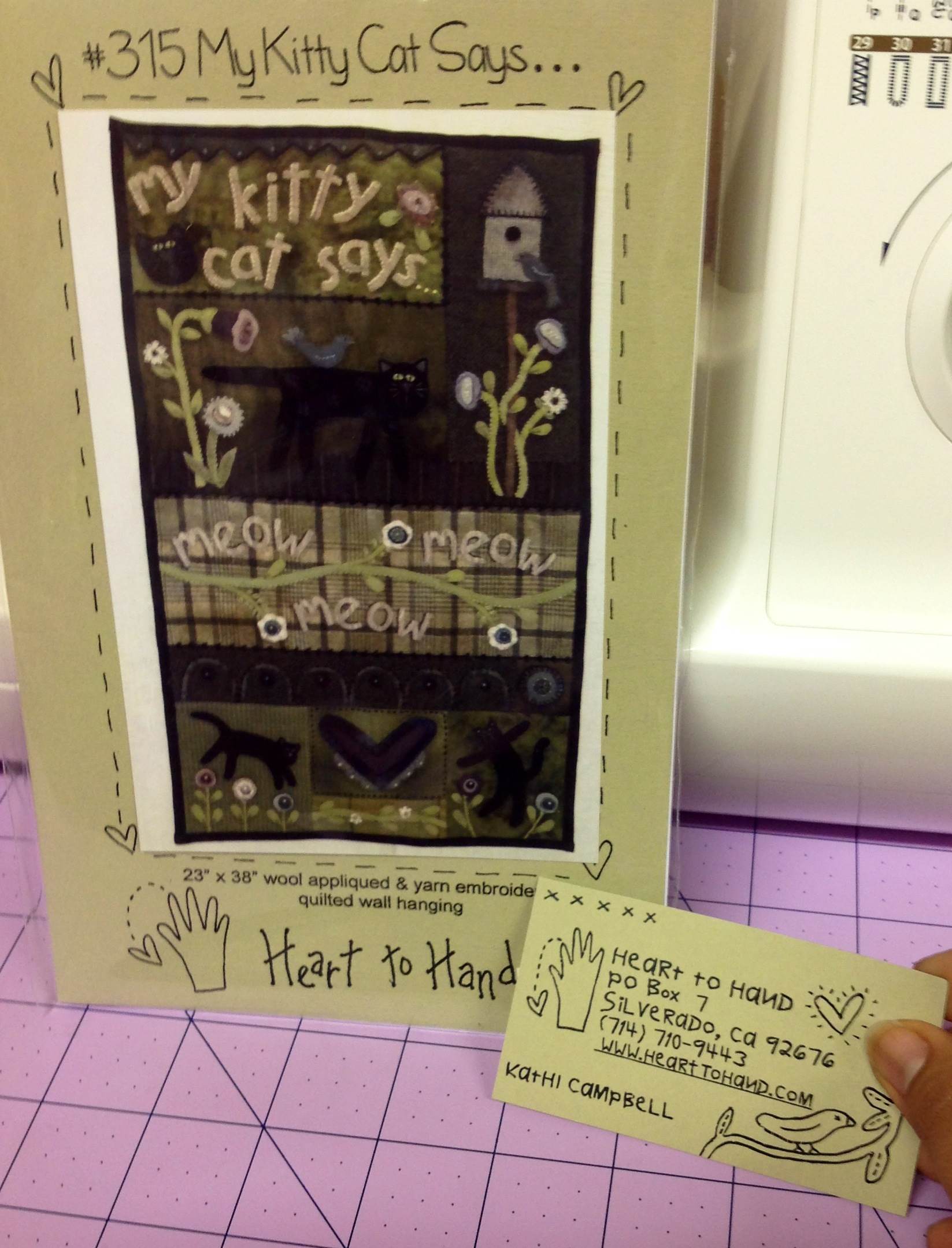 A cute “My Kitty Cat says…” pattern to make with wool from Heart to Hand ( Silverado, CA) .