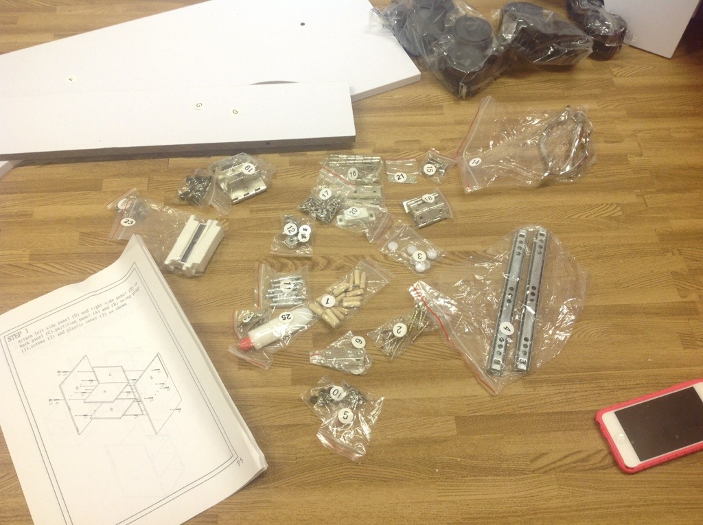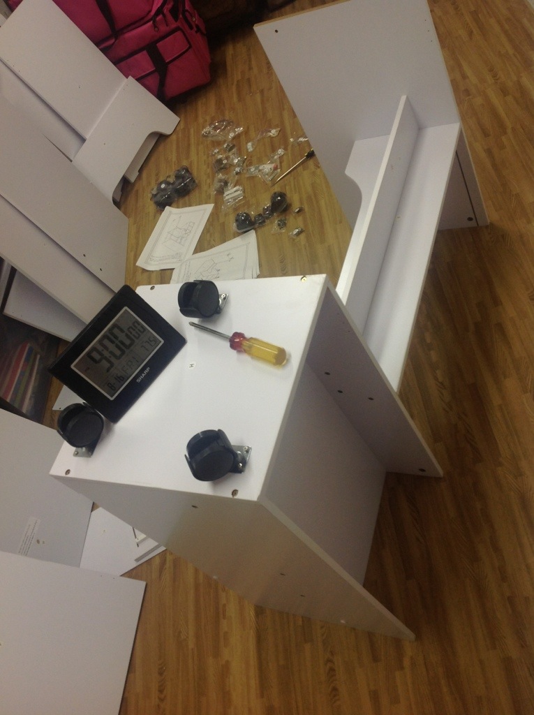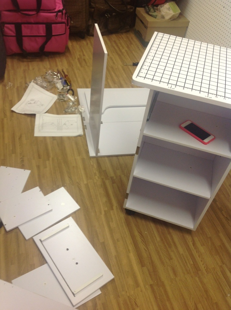 After spending a couple of hours on it, I made progress , but kept having trouble getting the screws on some of the hinges. I left it alone that night , walked into my crafty room the next morning and walked back out. Lol