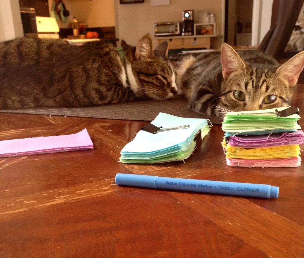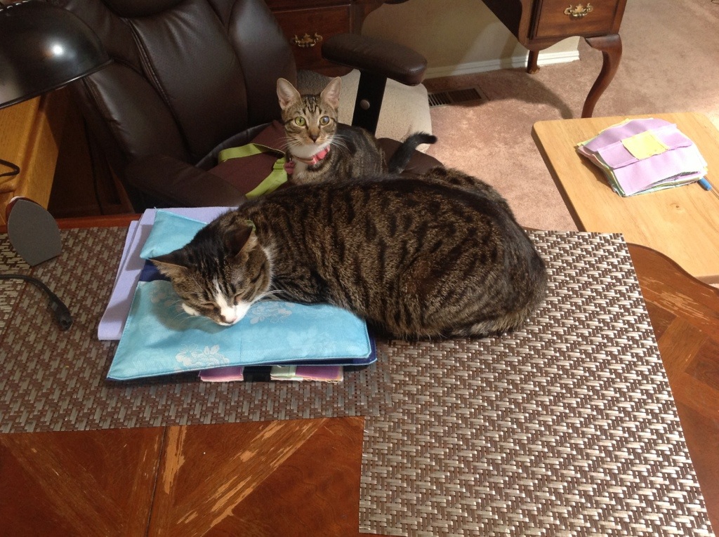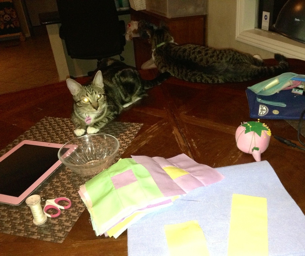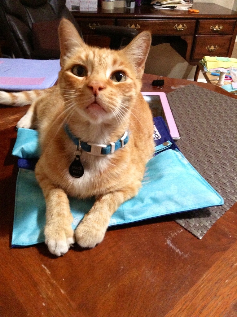 I LOVE the quilt, the colors are awesome, and like the other poster said, you make it look easy!! and i like the face your orange kitty is making, he looks kinda between shocked and yawn, love it π