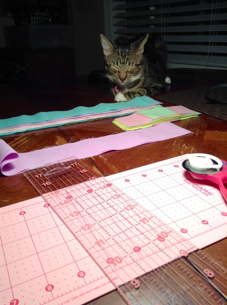 After finishing my first hand quilted kitty quilt, I decided to make quilts for my family too. So this one is for my little sister, it’s a Boxed Squares quilt using a pastel jelly roll from Joan’s.