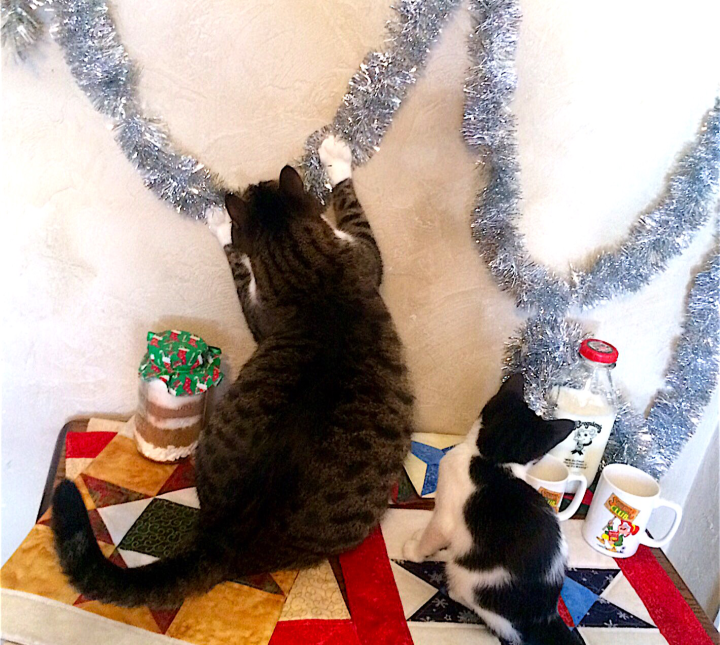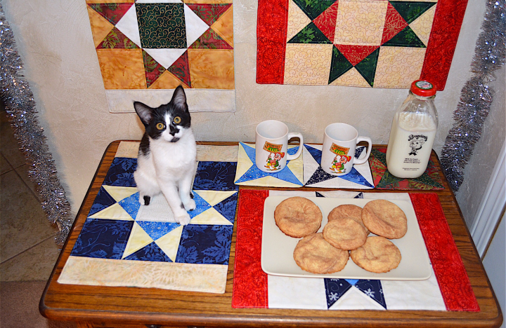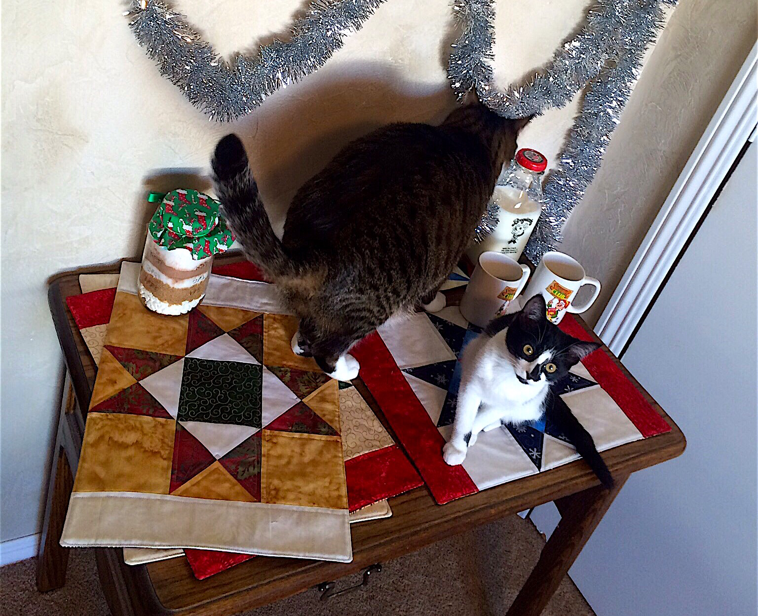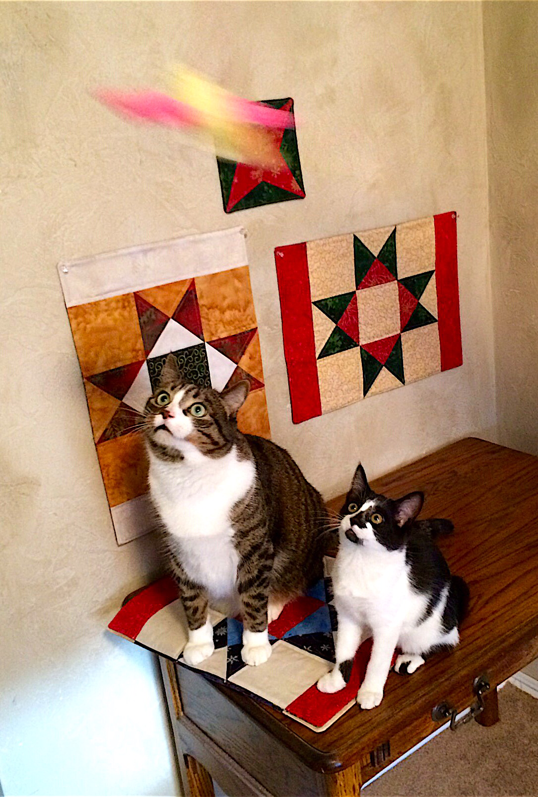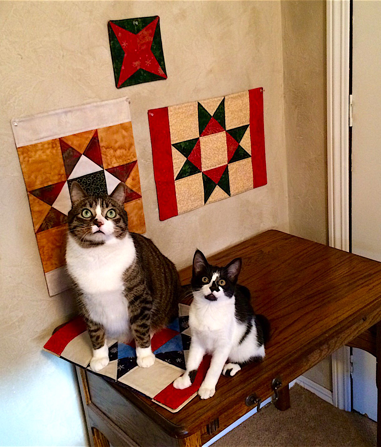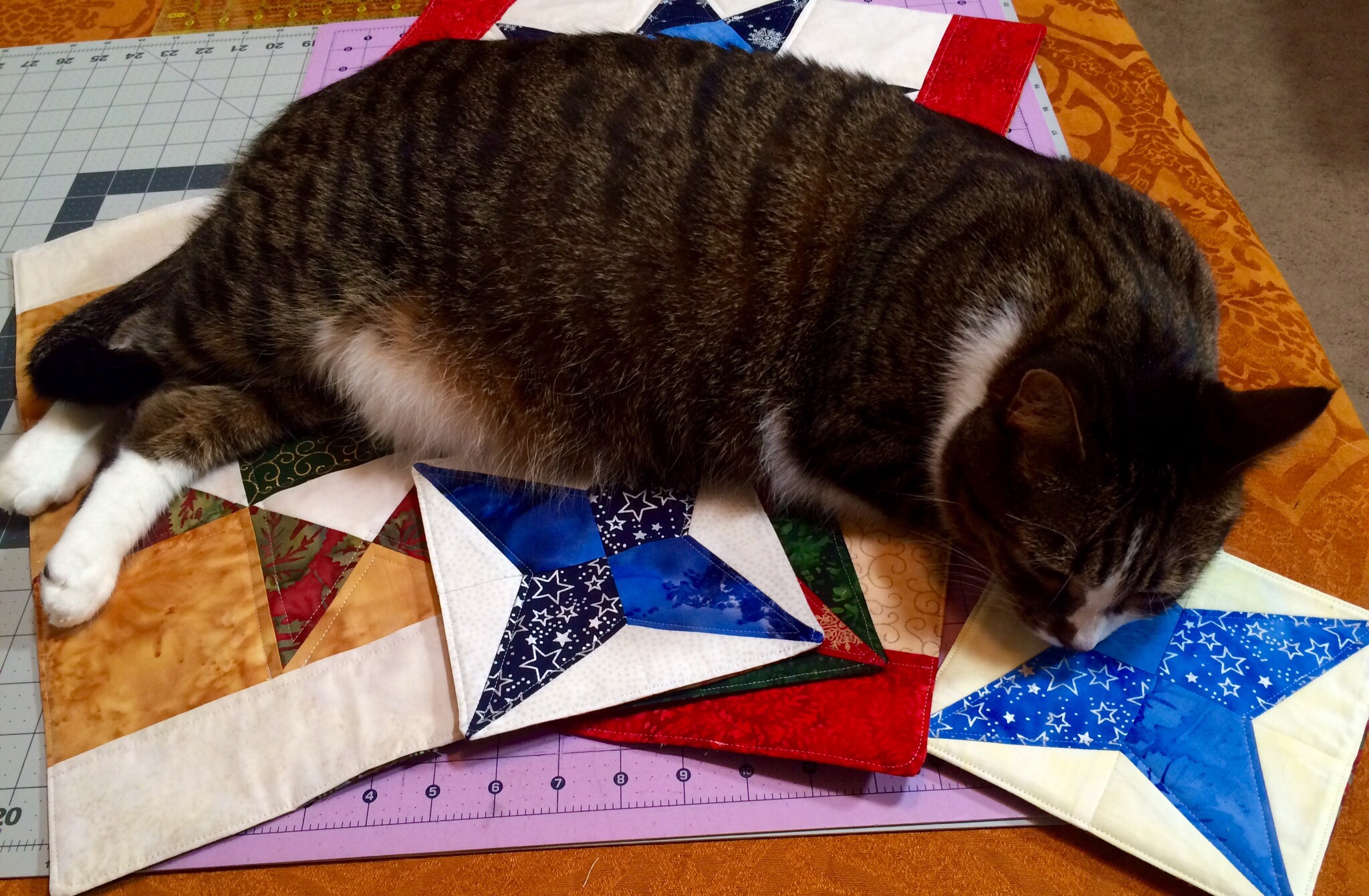 In my AccuQuilt post , I mentioned sharing pictures of my kitties here on my blog. As promised , here are pictures of Raymond being “crafty” and our newest addition to the family, a black and white mixed kitten named Audrey Frank! Enjoy!
