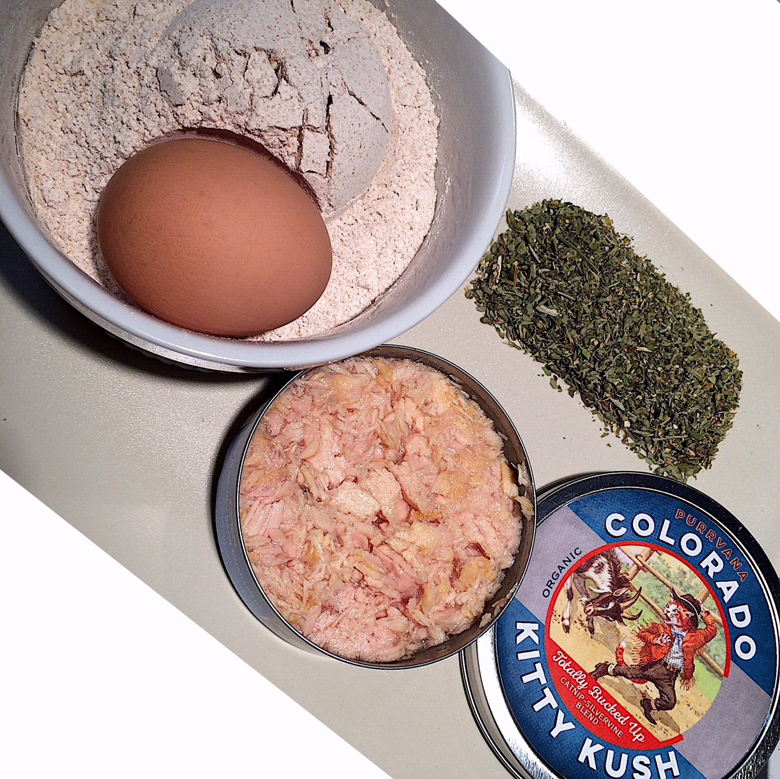 With all of these ideas in my head about transitioning our babies to healthier foods, I found this recipe that I just had to try as soon as we came home with Purrvana’s Kitty Kush. They are little “homemade kibble” with only 4 ingredients. It prompted me to read the ingredients on the back of the treats that we’ve been feeding them, and well, I can’t pronounce half of the ingredients in it! Why was I still feeding them all of this unnatural stuff?