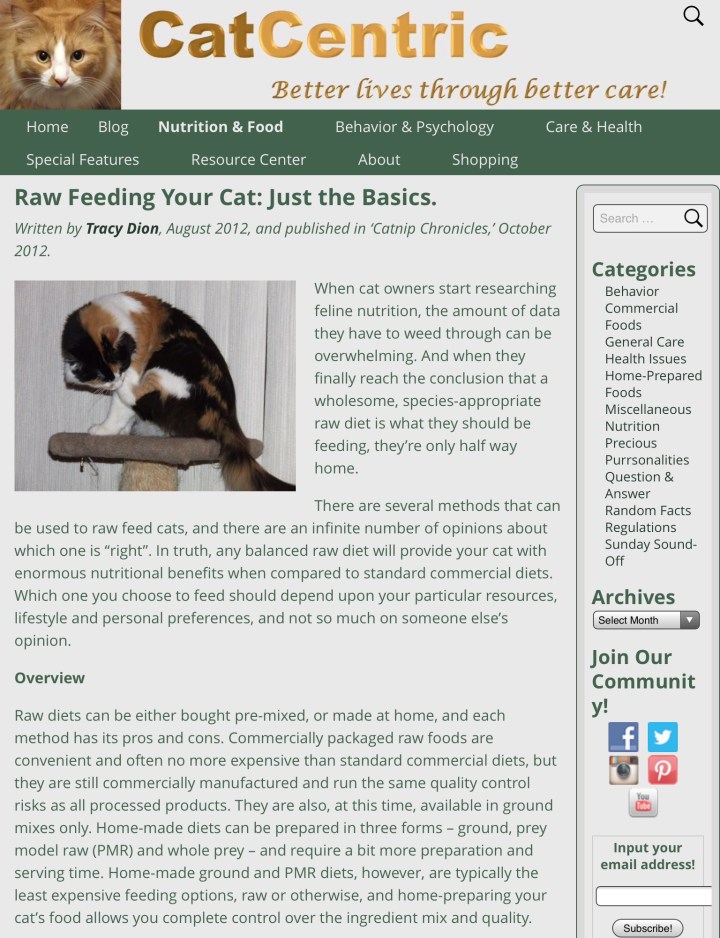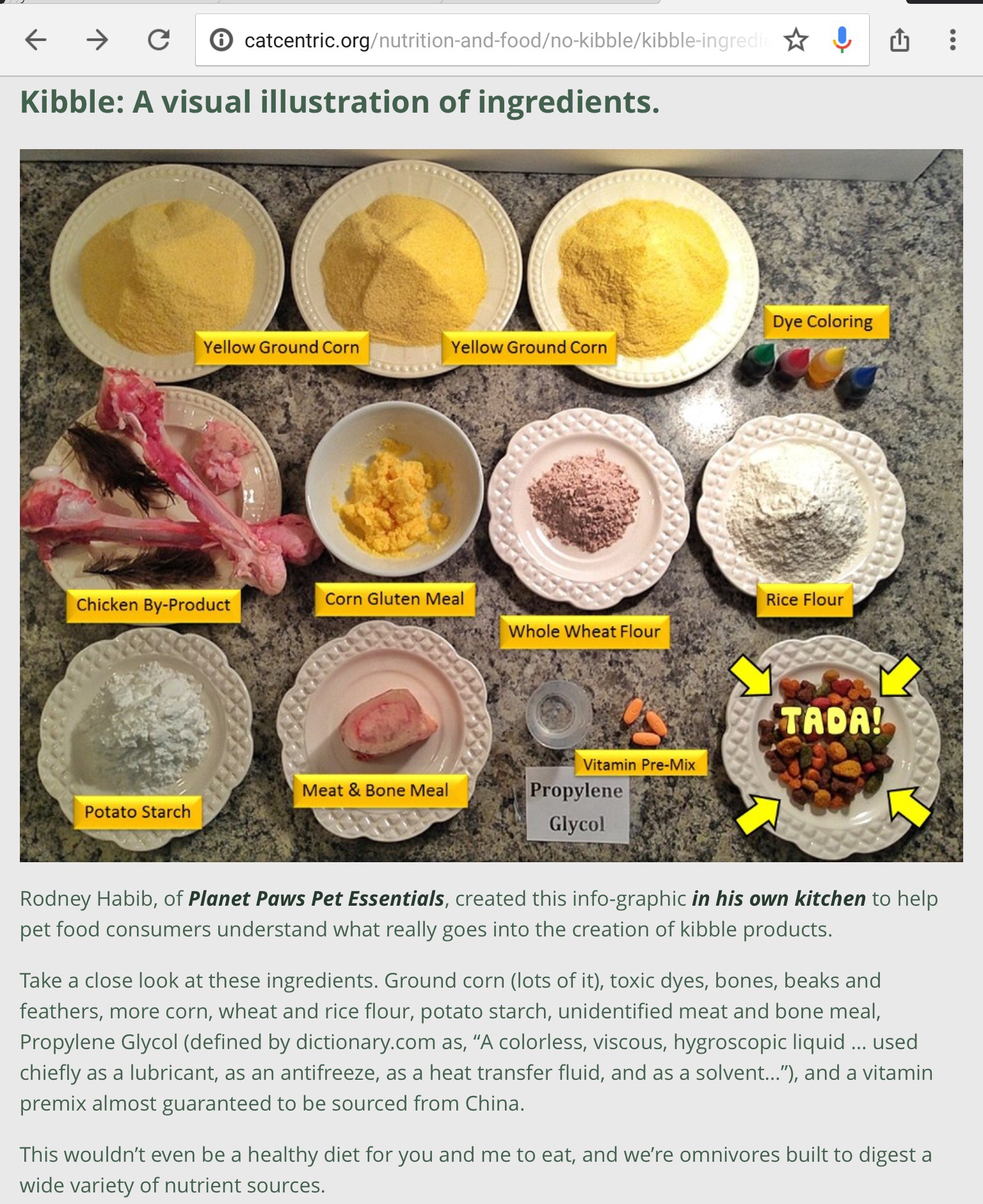 After learning about feeding our pets a more species-appropriate diet, we were so intimidated about where to begin. The pros and cons of feeding processed vs. raw are eye-opening and motivating! Here are some screen-grabs , loaded with information, that really pushed us to start to transition to raw! We learned a lot from CatCentric.org, it so detailed in teaching us about how to care for our cats better. I can’t possibly explain this as well as Tracy , so please check out her site! (www.CatCentric.org )